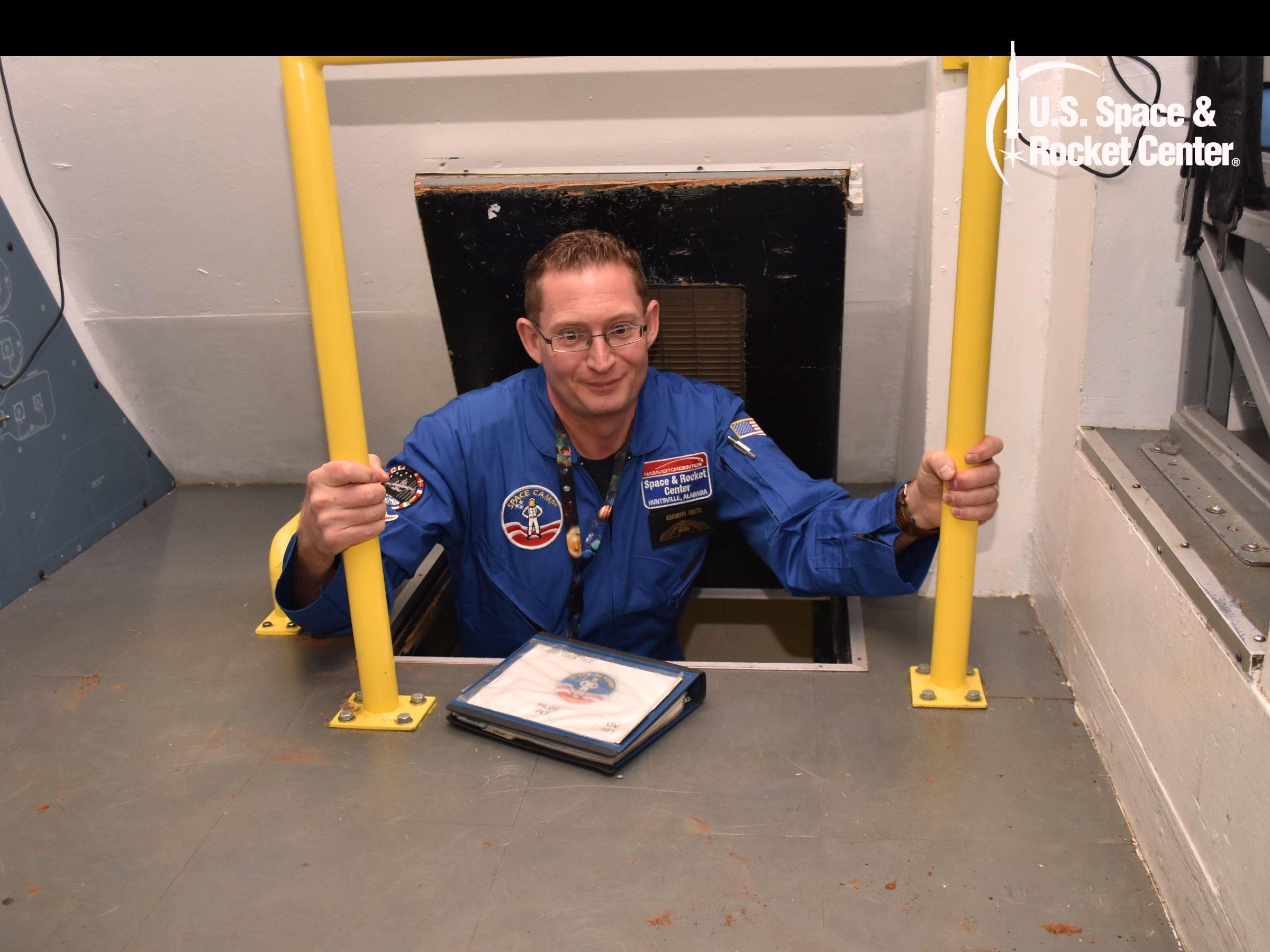 Ich habe noch etwas Zeit und gehe zum Andenkenladen, ein recht ordentlicher Souvenirshop am Eingang des Besucherzentrums. Noch fällt mir die Orientierung schwer und ich folge den Wegen, die ich mir bereits zuvor erschlossen hatte. Im Shop lerne ich David kennen, der Teil meines Teams sein wird. Er fällt mir auf, da er ebenfalls einen Ausweis trägt, der ihn als Space Camper outet. Ich komme mit ihm ins Gespräch und wir beschließen, dass wir uns einen Overall, also einen dieser blauen Flightsuits kaufen. Die 99 $ sind es uns wert, größtmögliche Authentizität während unserer Zeit zu gewährleisten. Für einen kleinen Aufpreis erhalten wir noch ein Namensschild mit schmucker Pilotenschwinge. So ausgestattet geht es in den großen Saal namens „Challenger“. Hier findet ab 13:30 Uhr der erste Programmpunkt des Tages statt. Wir erhalten eine Einführung durch den Astronauten Robert Lee „Hoot“ Gibson. Der fünffache Shuttle-Astronaut erzählt uns von seinen Abenteuern, stellt sich den interessierten Fragen des Publikums und verleiht der Veranstaltung eine gewisse Wichtigkeit.